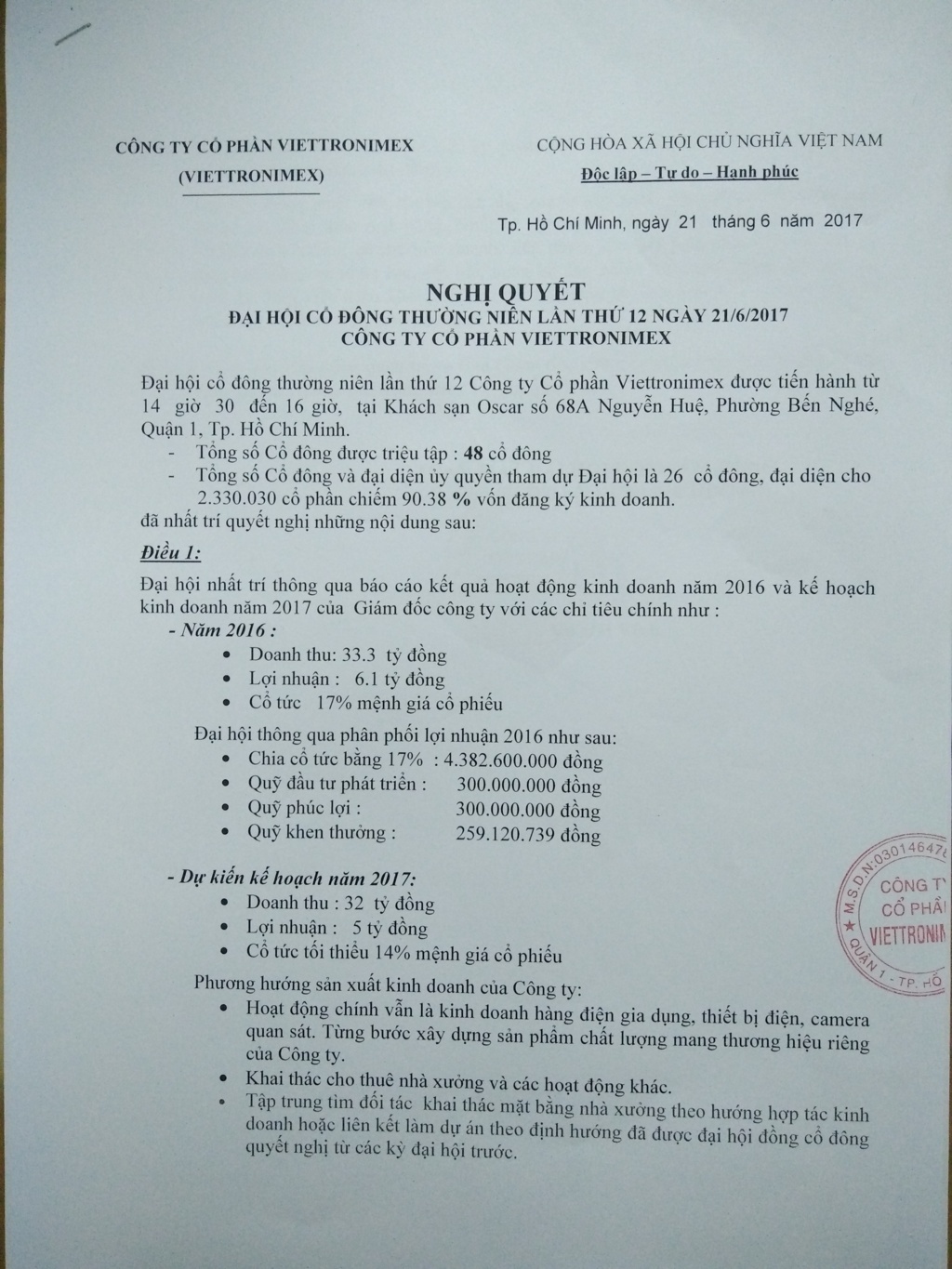 Nghi Quyết Đại Hội Cổ Đông Thường Niên Lần Thứ 12 Nghi Quyết Đại hội cổ đông thường niên lần thứ 12 ngày 21/06/2017. Trang trước Trang sau